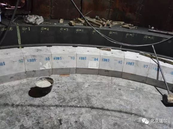 爐缸設(shè)計(jì)10層環(huán)形炭磚、4層陶瓷杯壁磚,陶瓷杯壁磚總高度3188mm.陶瓷杯壁磚采用燕尾槽結(jié)構(gòu),沒(méi)有冷熱面直接貫穿磚縫,陶瓷杯壁與環(huán)形炭磚之間采用剛玉澆注料整體澆注,通過(guò)燕尾槽將澆注體和陶瓷杯壁形成穩(wěn)定的整體,有效地增強(qiáng)了陶瓷杯壁的結(jié)構(gòu)穩(wěn)定性,并有效地防止堿金屬、鋅等金屬對(duì)炭磚的侵蝕。